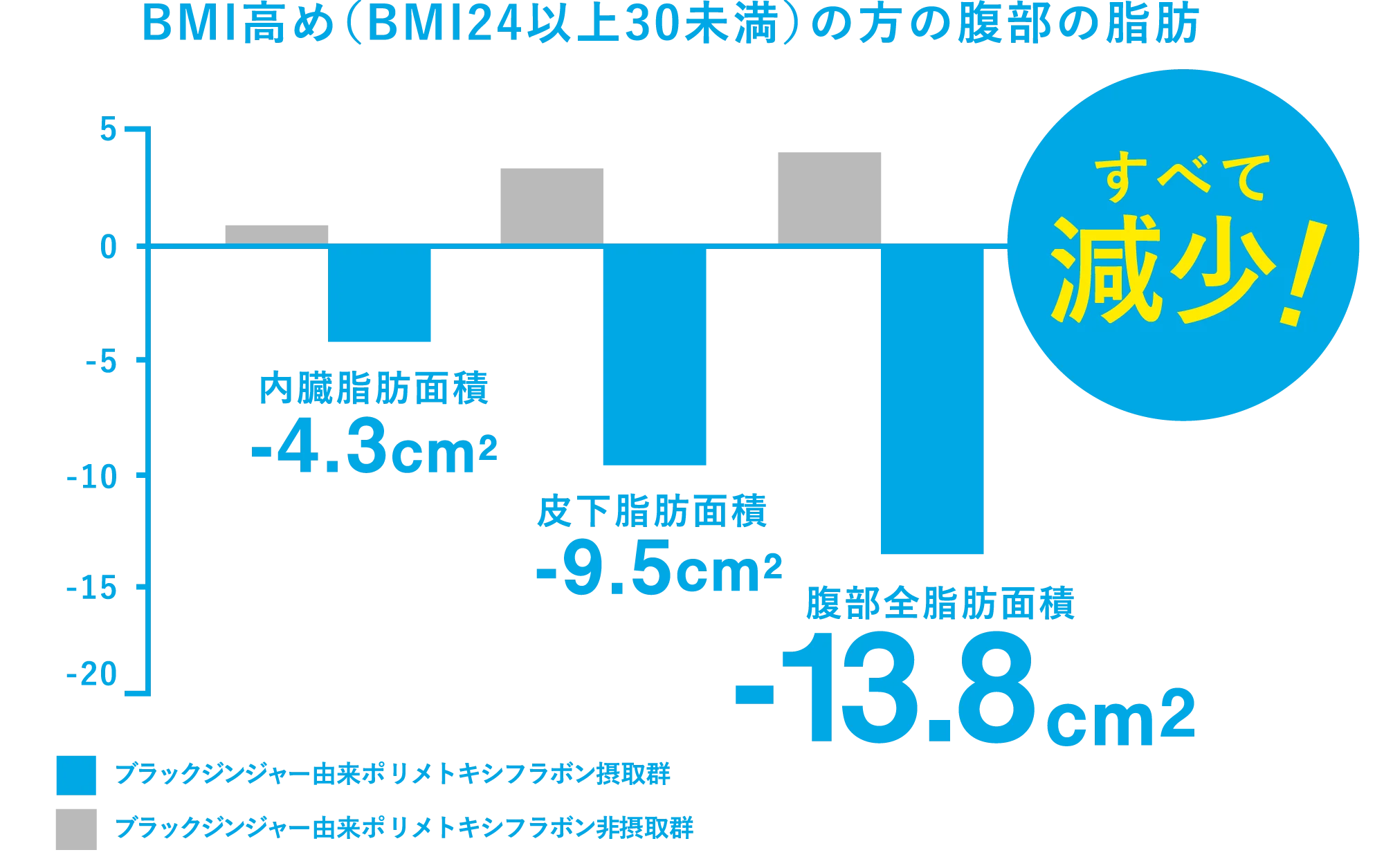 ブラックジンジャー由来ポリメトキシフラボン摂取群vs.ブラックジンジャー由来ポリメトキシフラボン非摂取群 # P‹0.05【被験者】メタボリックシンドロームに該当しないBMI 24kg/m2以上30kg/m2未満の男女(20歳〜64歳)かつ下記に該当しない健常な男女52名 高血圧(収縮期血圧 140mmHg以上、拡張期血圧 90mmHg以上)脂質異常症(HDLコレステロール40mg/dL未満、血中中性脂肪150mg/dL以上)高血糖(空腹時血糖126mg/dL以上)【試験デザイン】無作為化二重盲検並行群間比較試験【試験項目】内臓脂肪面積、皮下脂肪面積【試験食品】ブラックジンジャー由来ポリメトキシフラボン摂取群:ブラックジンジャー由来ポリメトキシフラボン12mg/日を含むカプセル。ブラックジンジャー由来ポリメトキシフラボン非摂取群:試験食と外見が同一でブラックジンジャー由来ポリメトキシフラボンを含まないカプセル。【摂取期間】12週間 ※12週目のデータを抜粋【出典】Diabetes Metab Syndr Obes. 2018;11:447-458. 掲載の臨床データに基づき作成 *研究レビューの対象となった論文のうち、代表的な1報を事例として提示しています。