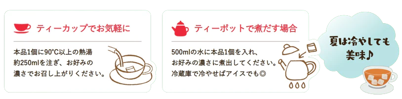 500mlの水に本品1個を入れ、お好みの濃さに煮出してください。冷蔵庫で冷やせばアイスでも◎