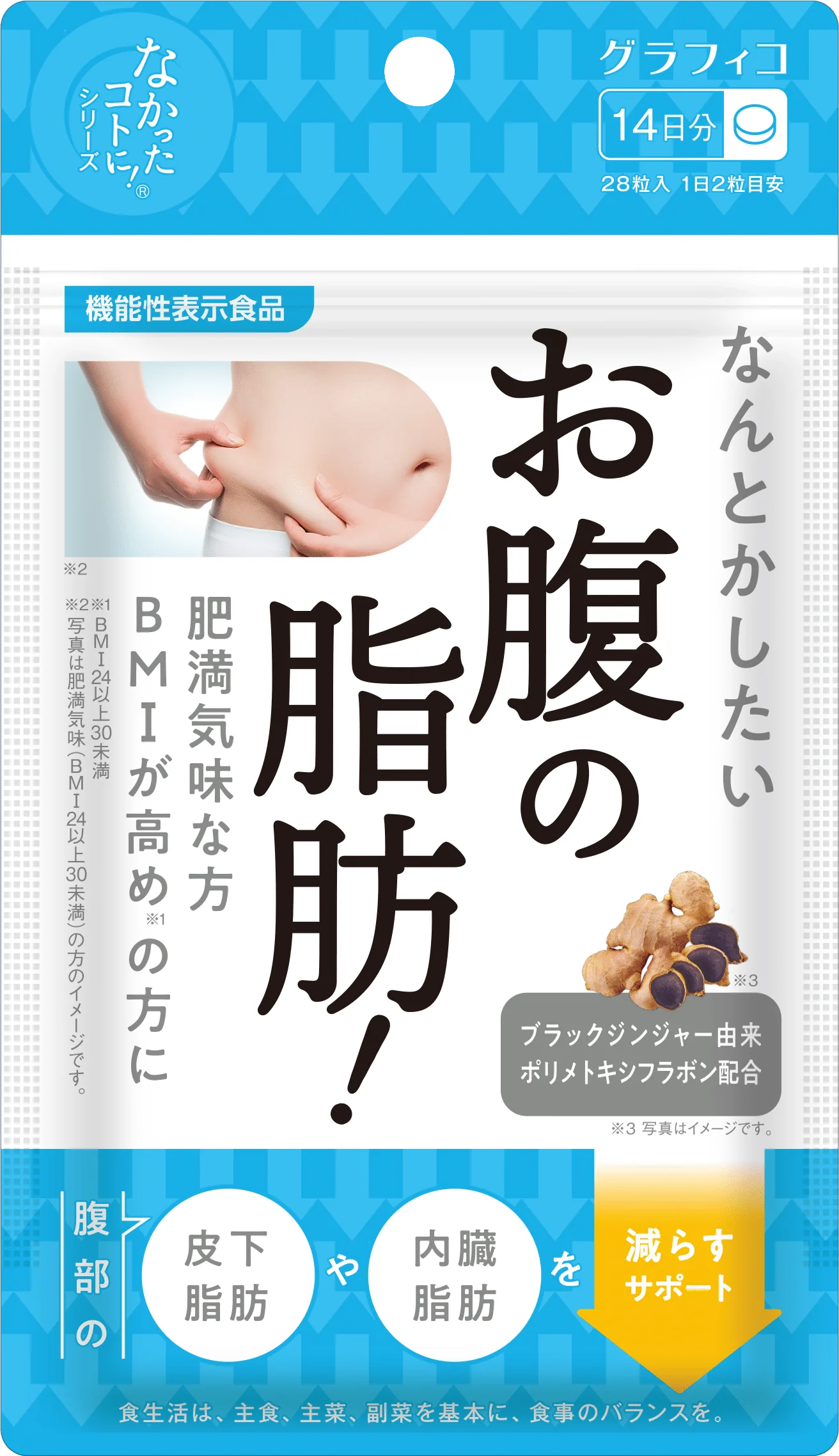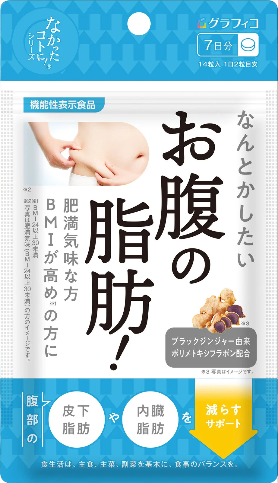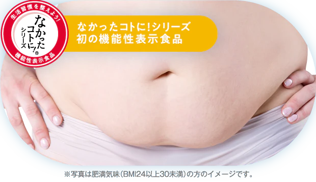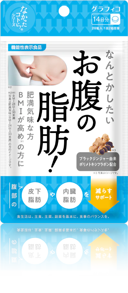 本品にはブラックジンジャー由来ポリメトキシフラボンが含まれます。ブラックジンジャー由来ポリメトキシフラボンは、日常生活字のエネルギー代謝において脂肪を消費しやすくする作用により、肥満気味の方、BMIが高め(BMI24以上30未満)の方の腹部の脂肪(内蔵脂肪及び皮下脂肪)をへらす機能があることが報告されています。