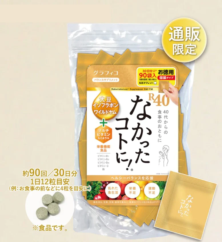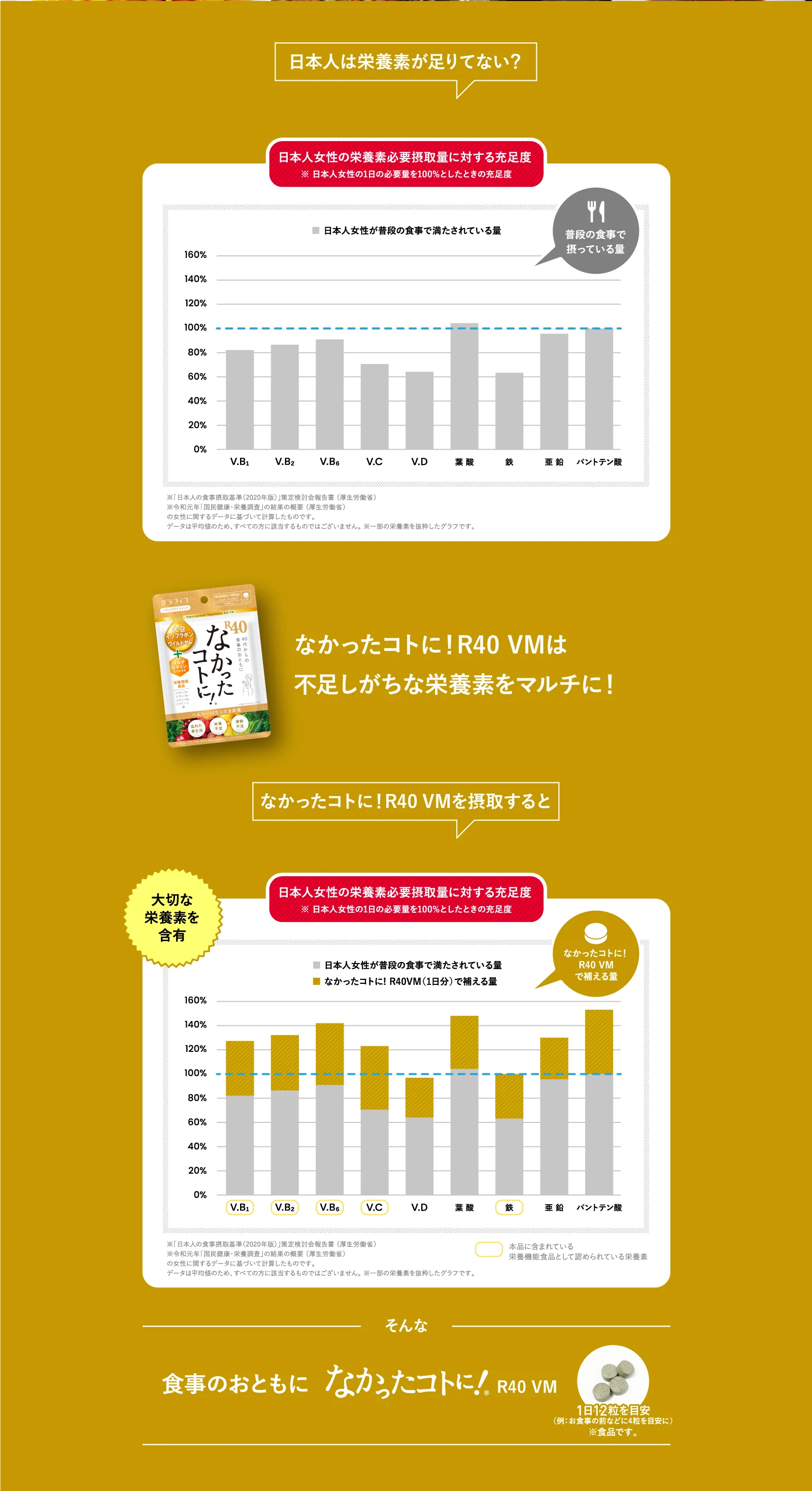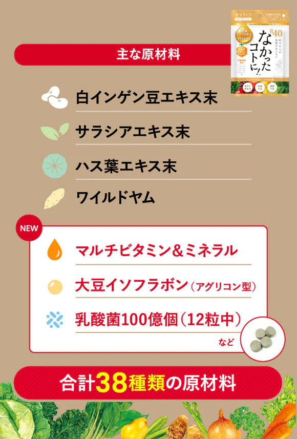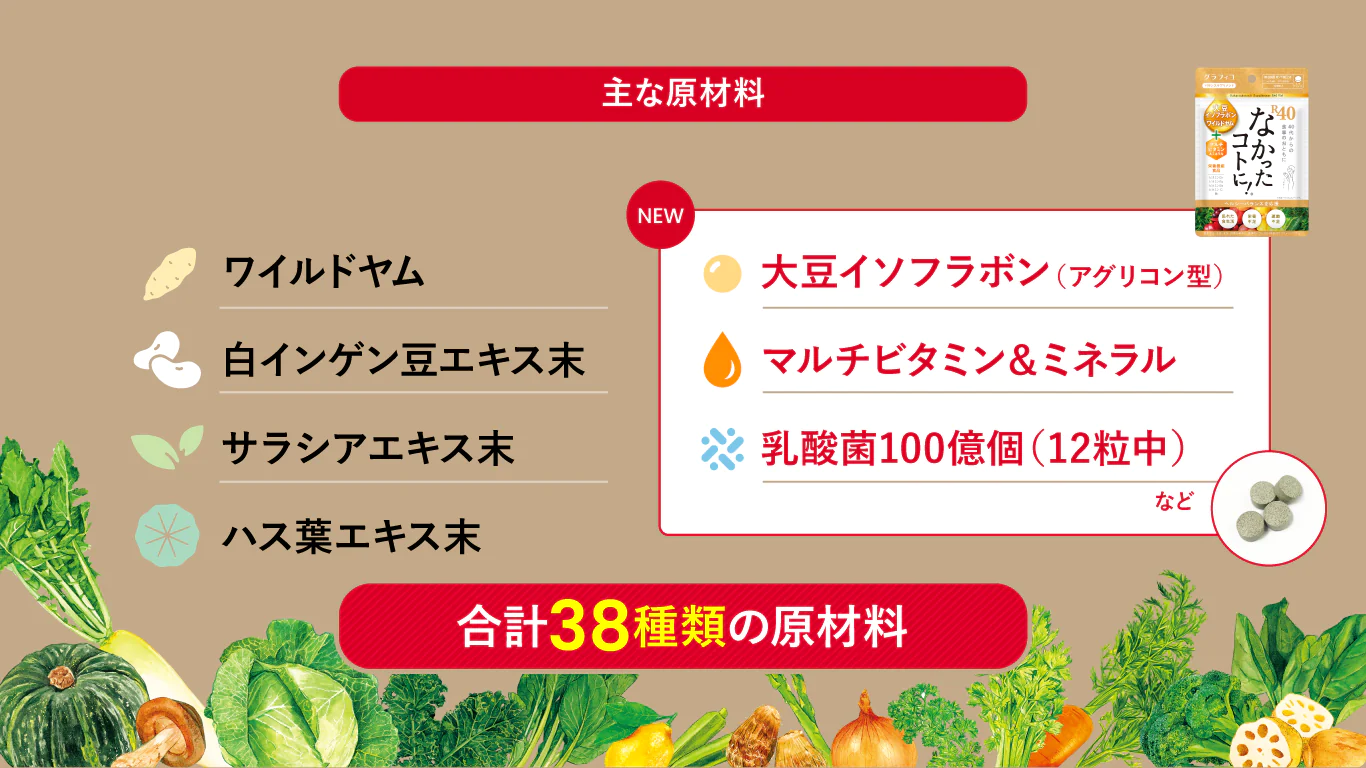 人気原材料※1を追加しリニューアル! 「なかったコトに!VM」にプラスで 大豆イソフラボン、ワイルドヤムなどを追加! アラフォー世代の食事のおともに、 ヘルシーバランスを応援します。