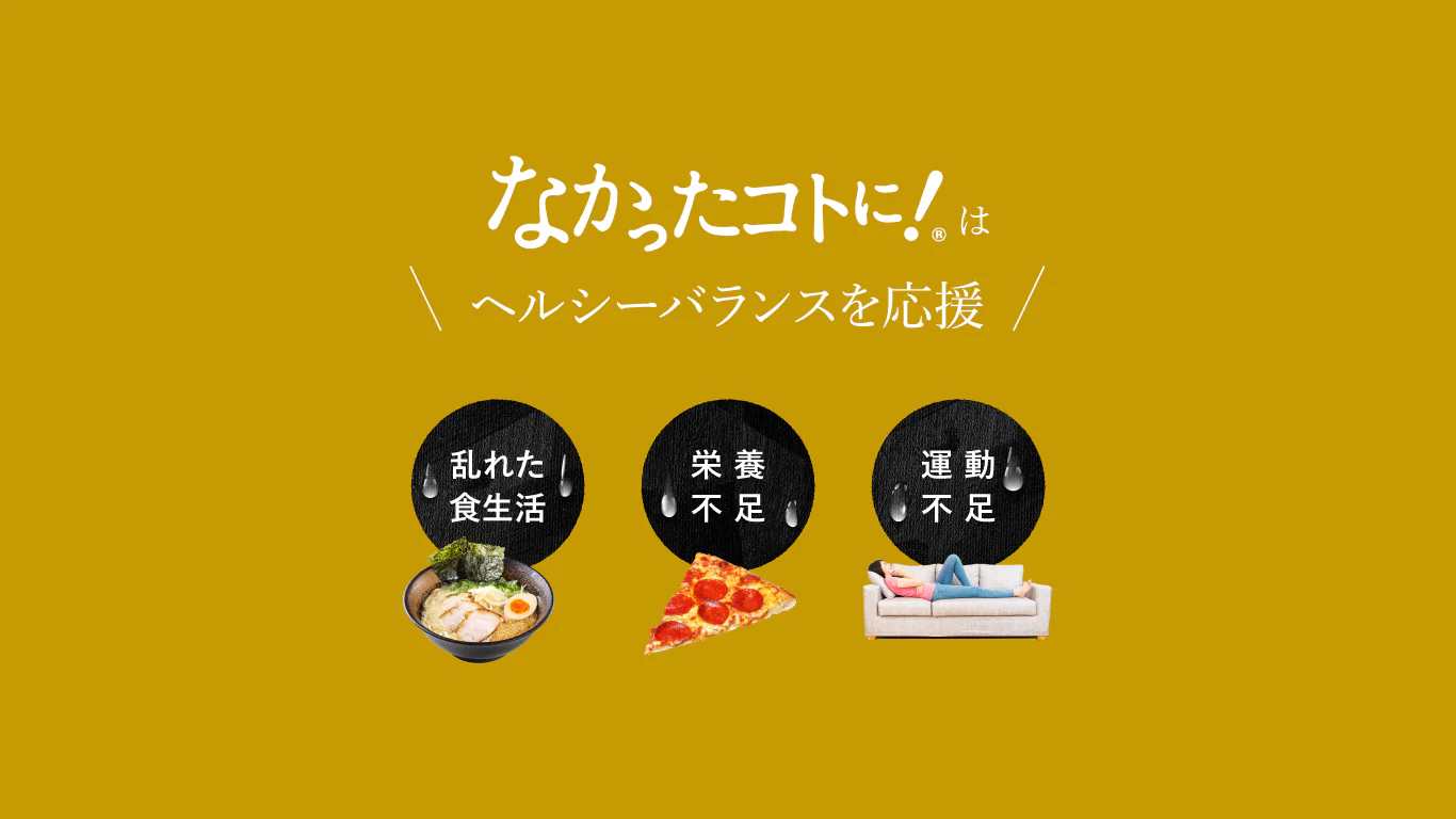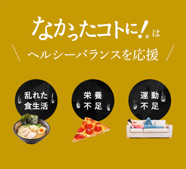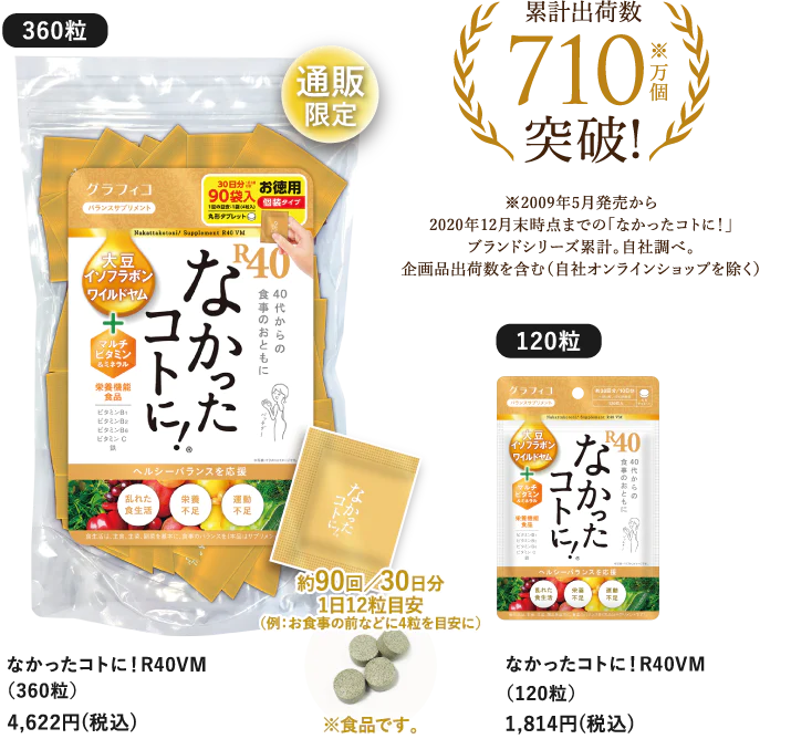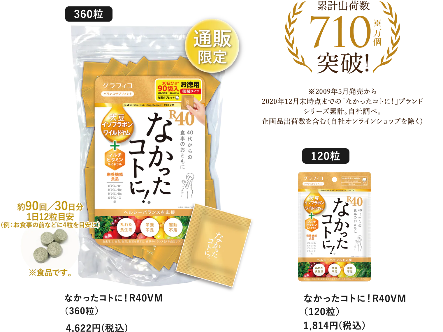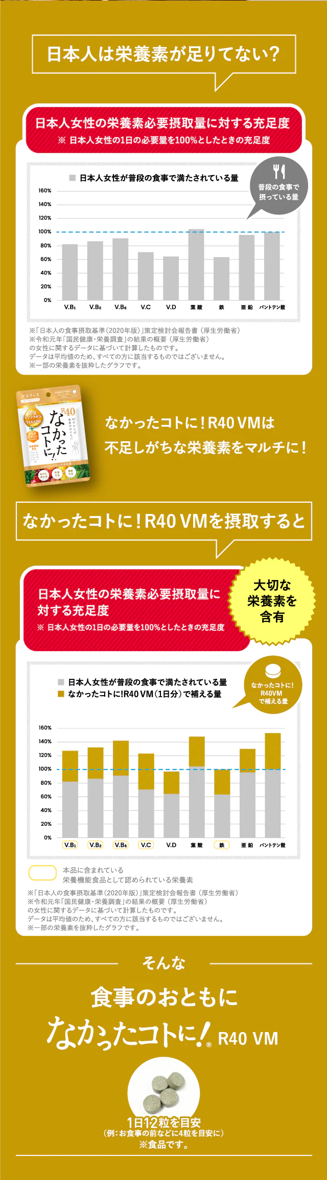 人気原材料※1を追加しリニューアル! 「なかったコトに!VM」にプラスで 大豆イソフラボン、ワイルドヤムなどを追加! アラフォー世代の食事のおともに、 ヘルシーバランスを応援します。