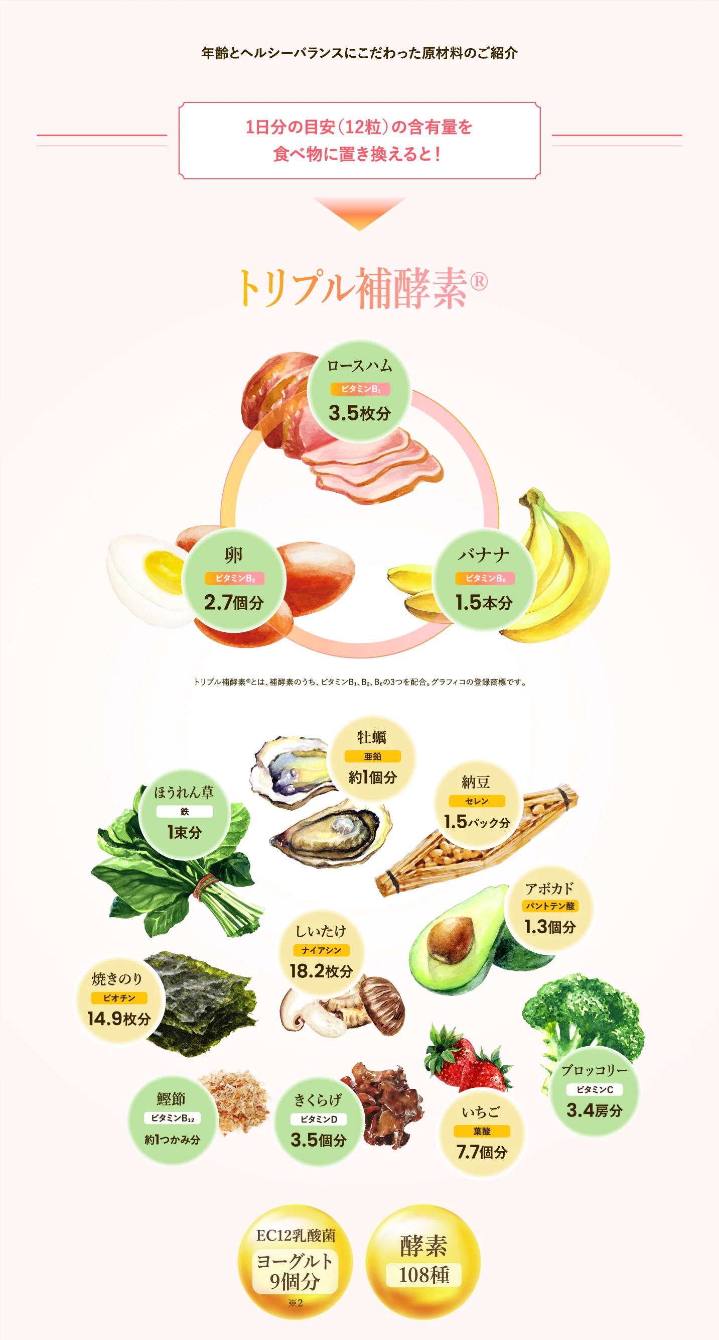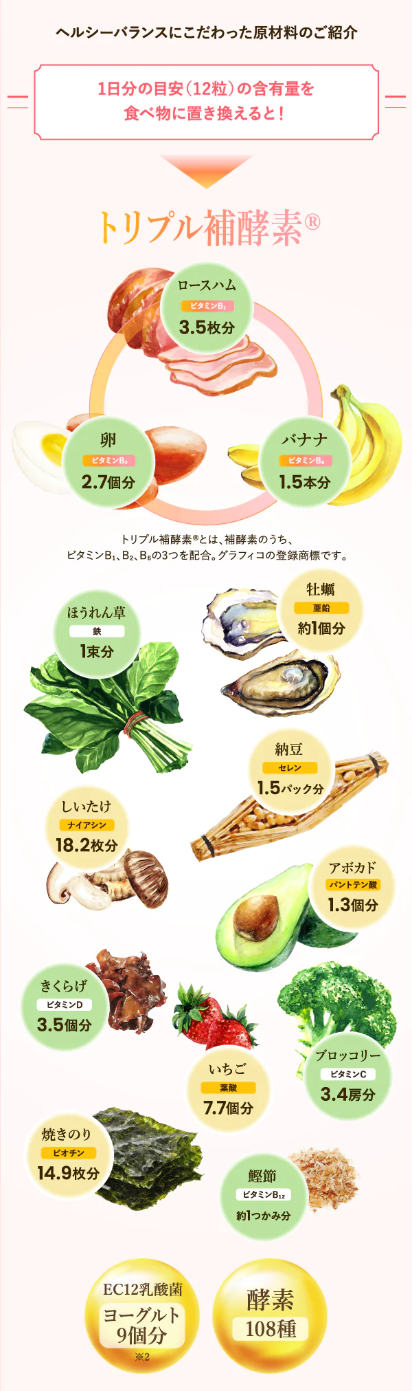 ※摂取したカロリーや不摂生等がなかったコトになる訳ではありません。食生活は、主食、主菜、副菜を基本に食事のバランスを。 ※1 ファストアスク調査「入っていたら買いたいと感じるもの」ランキングより2019年12月6日〜12月9日 n=300 ※2 トリプル補酵素とは、 ビタミンB1、B2、B6の3つの補酵素のこと。グラフィコの登録商標です。