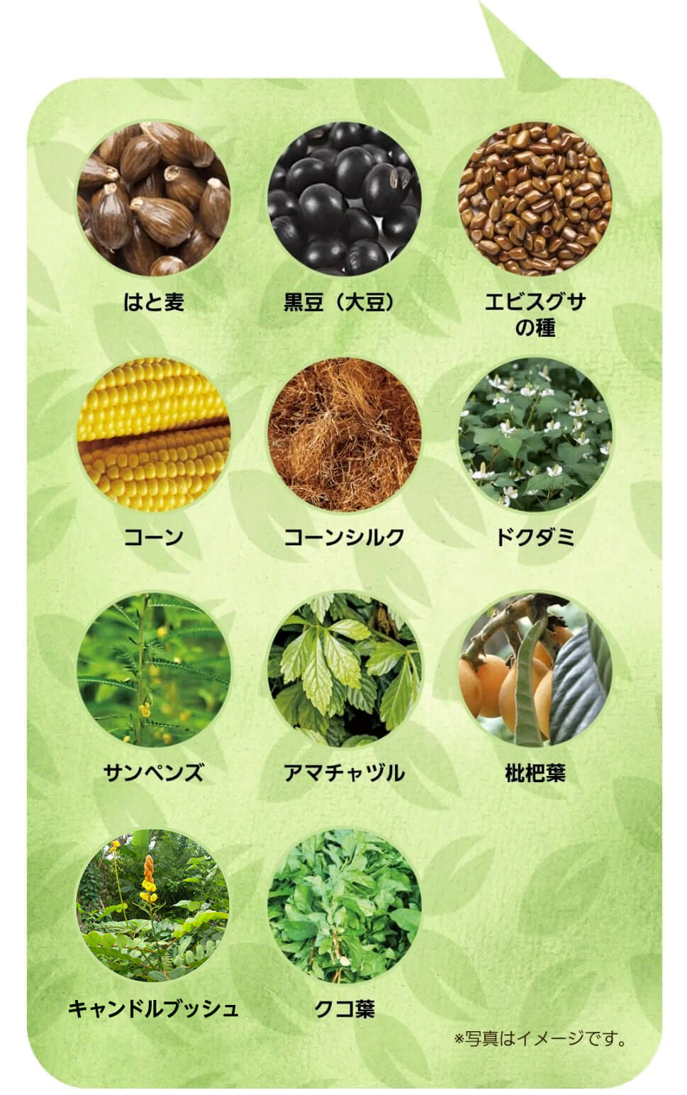 キャンドルブッシュ(インドネシア産)、はと麦、黒豆(大豆)、エビスグサの種、コーンシルク、コーン、ドクダミ、枇杷葉、サンペンズ、アマチャヅル、クコ葉