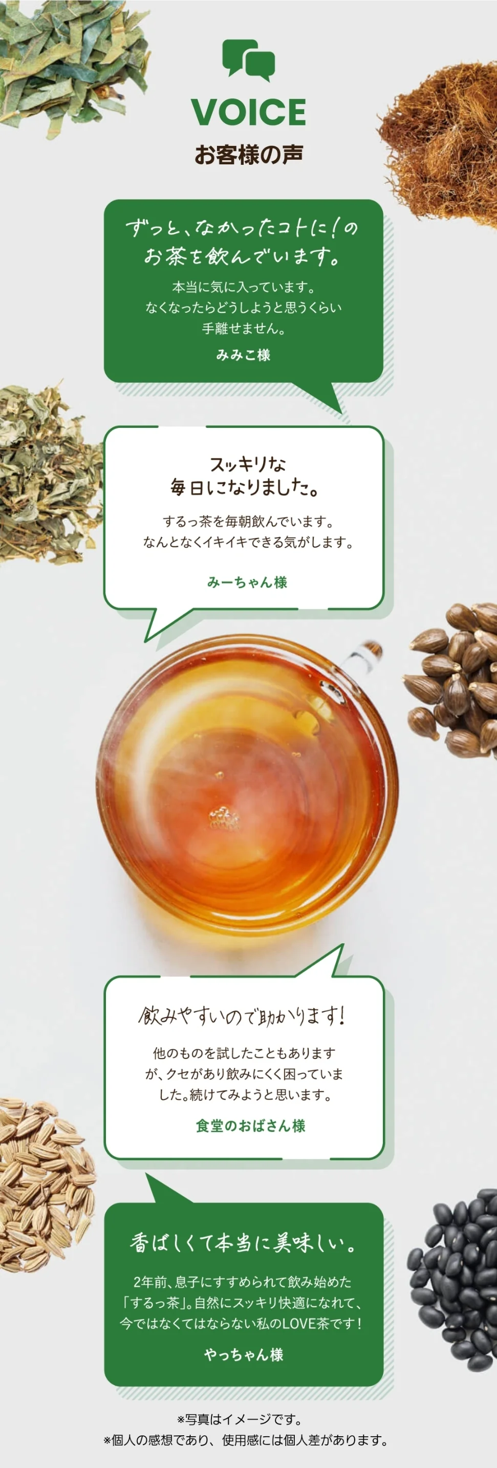 今回(2022年2月)のリニューアルでどくだみと枇杷葉を増量いたしましたが、 これまでと同様に茶師の方と相談し、香ばしい香りと飲みやすい味に仕上げています。 一方で、濃くても味が苦くならないように仕上げた点に、逆に注意が必要です。 それは、おなかが緩くなる成分が入っているためです。 お湯に浸す時間で濃さを調整できるのが良いところですが、浸す時間をチェックせずに 忘れると当然濃くなってしまいます。 もしそうなってしまった時は、お湯で薄めたり、飲む量を減らすなど、 飲み過ぎには十分に気をつけてお召し上がりください。 ご自分の体調に合わせて浸す時間で濃さをお好みで変えたり、ベストな濃さを探すのも 楽しみのひとつかなと思います。